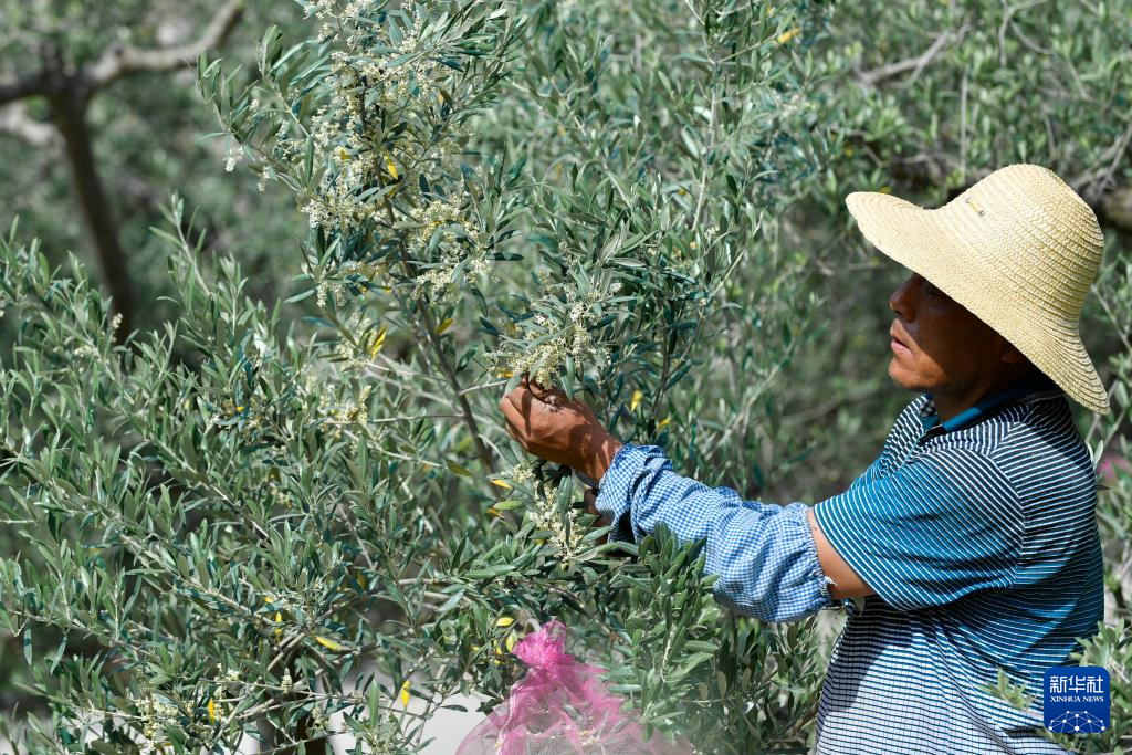 5月17日,在隴南市武都區(qū)漢王鎮(zhèn)的祥宇國家級萬畝有機油橄欖種植示范基地,果農觀察油橄欖開花情況。